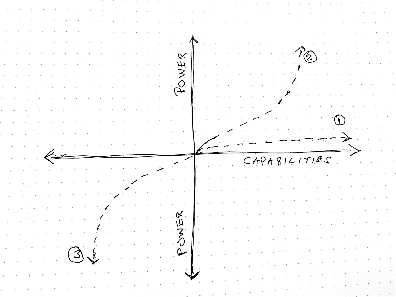 But there’s one more missing part of the human agency conversation I’ll point out before wrapping this up. Most conversations assume that humanity is at minimum moving to the right on the X-axis, increasing capabilities (Line #1 below), and it’s just a matter of how far. I’ve tried here to introduce vertical movement to represent the need to increase power as well (Line #2). But even I have been assuming a degree of positive motion, and there’s also a very real possibility of sliding backwards, down and to the left, Line #3 in the advanced graphical image below.
