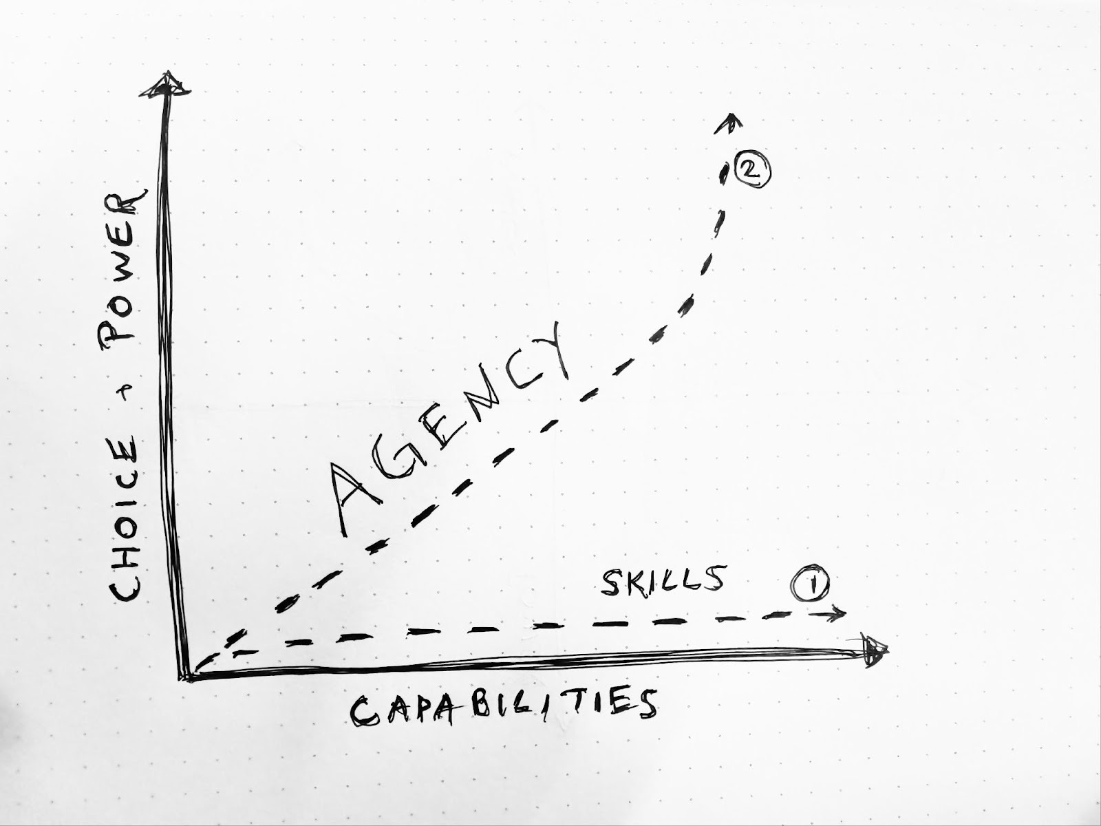 In the first image, the X-axis represents capabilities, and the Y-Axis represents choice and power. Most of the conversation about human agency is along the Line #1, just increasing capabilities horizontally with no real increase in power vertically. The path of increased human agency would look more like Line #2, moving to the right and also up.